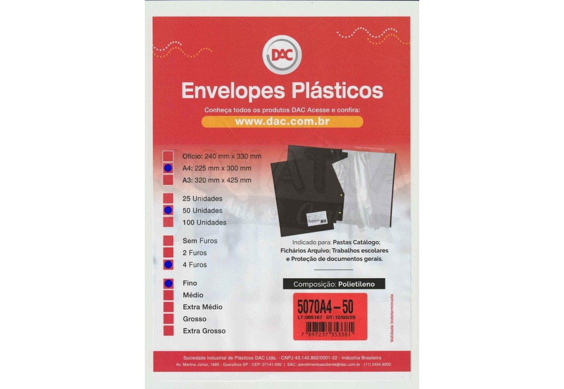 ENVELOPE PLASTICO DAC 4 FUROS A4 FINO PCT 50 UNI