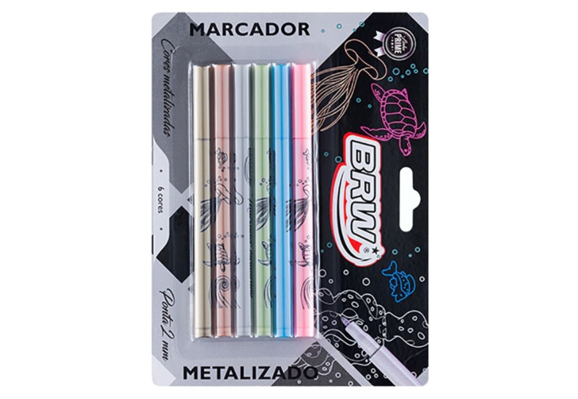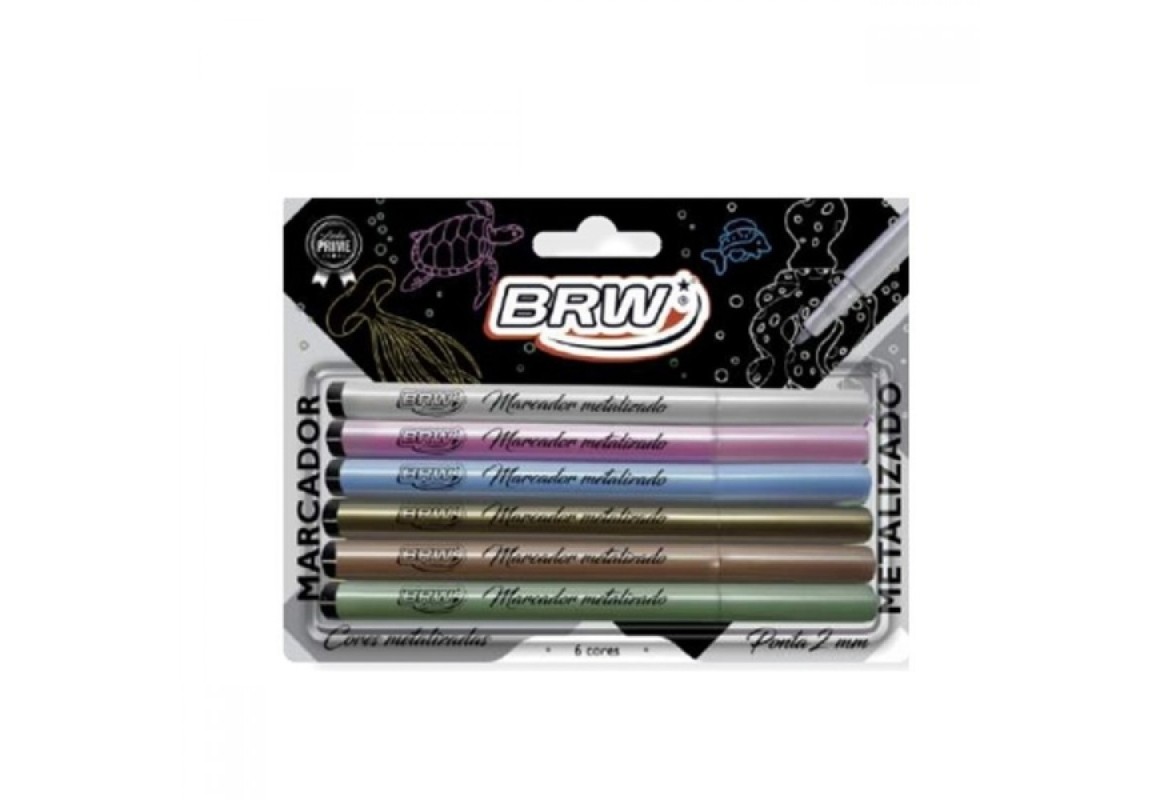 Marcadores BRW com 6 cores metalizadas, escreve no papel escuro, secagem rapida, ponta redonda de 2.0 mm. Ideal para papéis, taças, copos, quadros, janelas, espelhos e outros.
