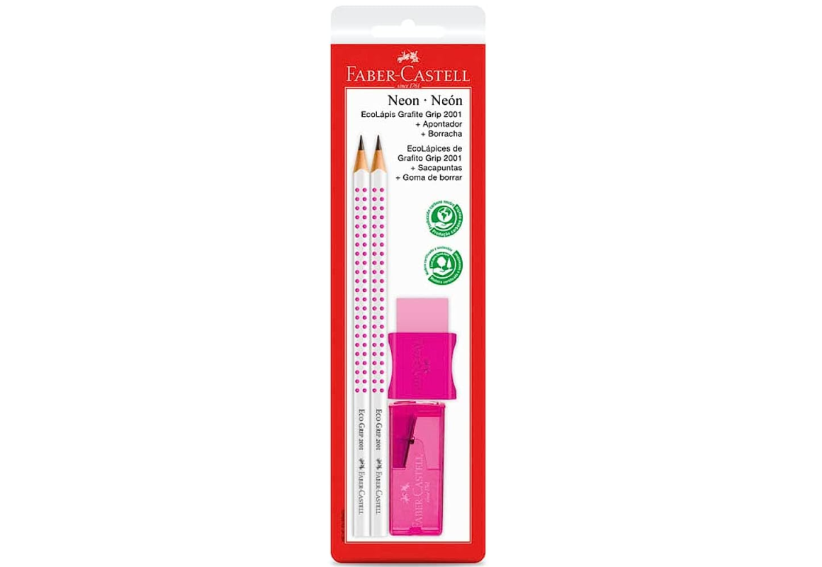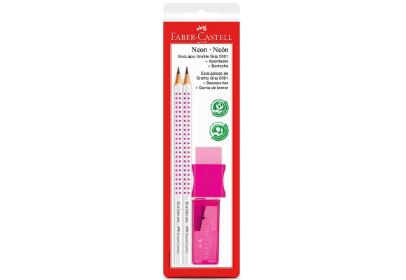 KIT ECOLAPIS GRIP ROSA NEON+BORRACHA+APOTADOR FABER CASTELL